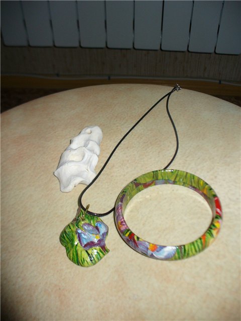 ну наконец то я доделала творение своего сына!!!! На летнем курсе у нас в городе, дети с нейропсхологом лепили из соленого теста такие вот штучки....Лариса сказала - будут кулончики - мама отдекупажит....еще купила браслет деревянный - теперь целый комплект у меня, буду летом фарсить