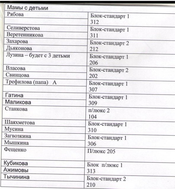Цитата: Marsea от 18 Января 2012, 13:14:55Объявление для проживающих в ГВ.Стоимость проживания и питания 1 мамы с 1 ребенком в стандарте 1 категории - 850 рублей/сутки. - номера 304-307, 309-313(В блоке - 2 номера. Туалет и душевая кабинка - в блоке).Есть варианты подешевле:Стандарт 1 категории на 2 этаже - 820 рублей/сутки номера 210, 211,212В блоке туалет, напольный душ (кафельная плитка и рожок) НЕ душевая кабинка.Стандарт 2 категории - на 2 и 3 этажах- 770 руб/сутки номера 202,301,302,308В блоке туалет, напольный душ (кафельная плитка и рожок) НЕ душевая кабинка. Интерьер похуже.Варианты покомфортнее:однокомнатный п/люкс 2 кат - 970 рублей/сутки номер 205(Шаяхметова)кровать плюс диван, свой санузел, душ.однокомнатный п/люкс 1 кат - 1 170 рублей/сутки номера 213, 313Двухспальная кровать, свой санузел, душ.По номерам - отпишитесь!!!! По умолчанию всем ставлю за 850 руб.!Что лучше и удобнее из номеров???кроме за 1170)))Хочу за 970 руб. номер 205(Шаяхметова), а на каком этаже находиться????