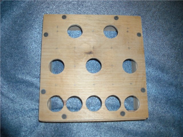 Осталось много бутылочек.Я их тщательно вымыла,а наш папа на куске фанеры выпилил кружочки чуть больше диаметра дна бутылочки.Сделали боковины чуть меньше высоты бутылочки.Получилась подставочка без дна ,т.к. если бутылочка провалится достать не реально.Вместо дна у нас книга.Сына с удовольствием ставит бутылочки в дырочки.