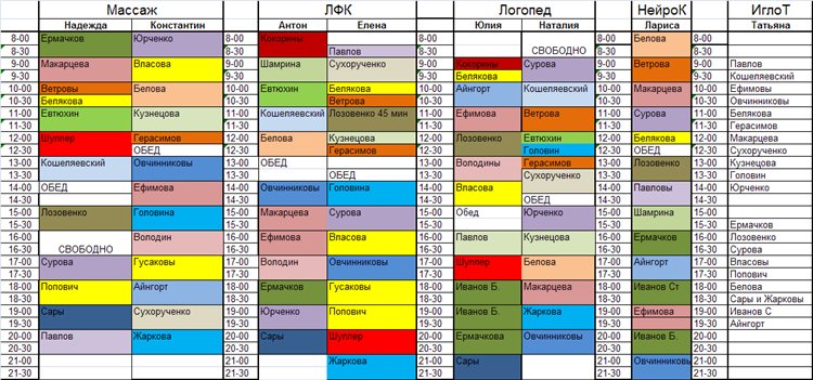 Выкладываем расписание. Постарались учесть уже окончательно все пожелания. Менять больше ничего не будем, либо уже на месте по ситуации. Время на иголки, акву и остеопатов выложу в ближайшее время.