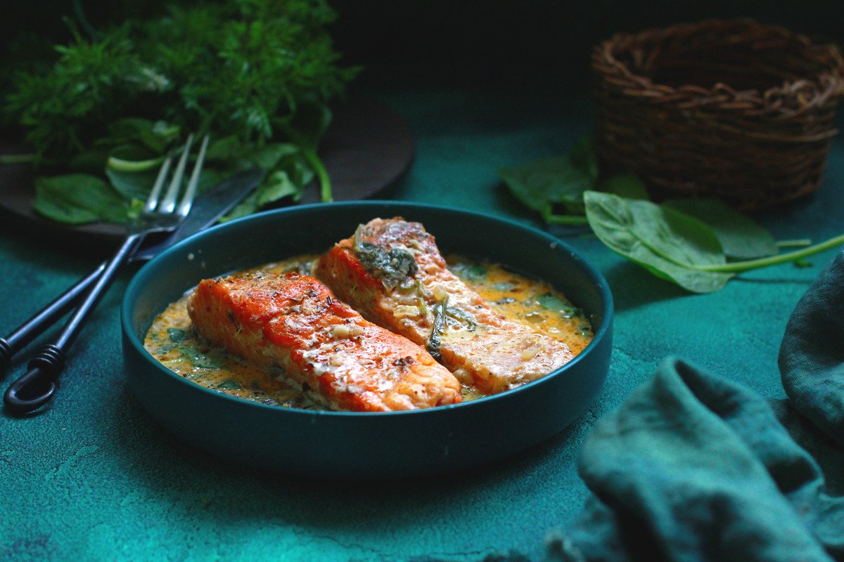 Лосось в сливочном соусе с хреном и шпинатом