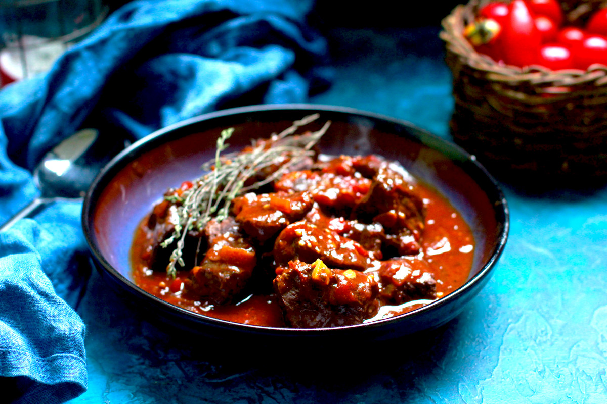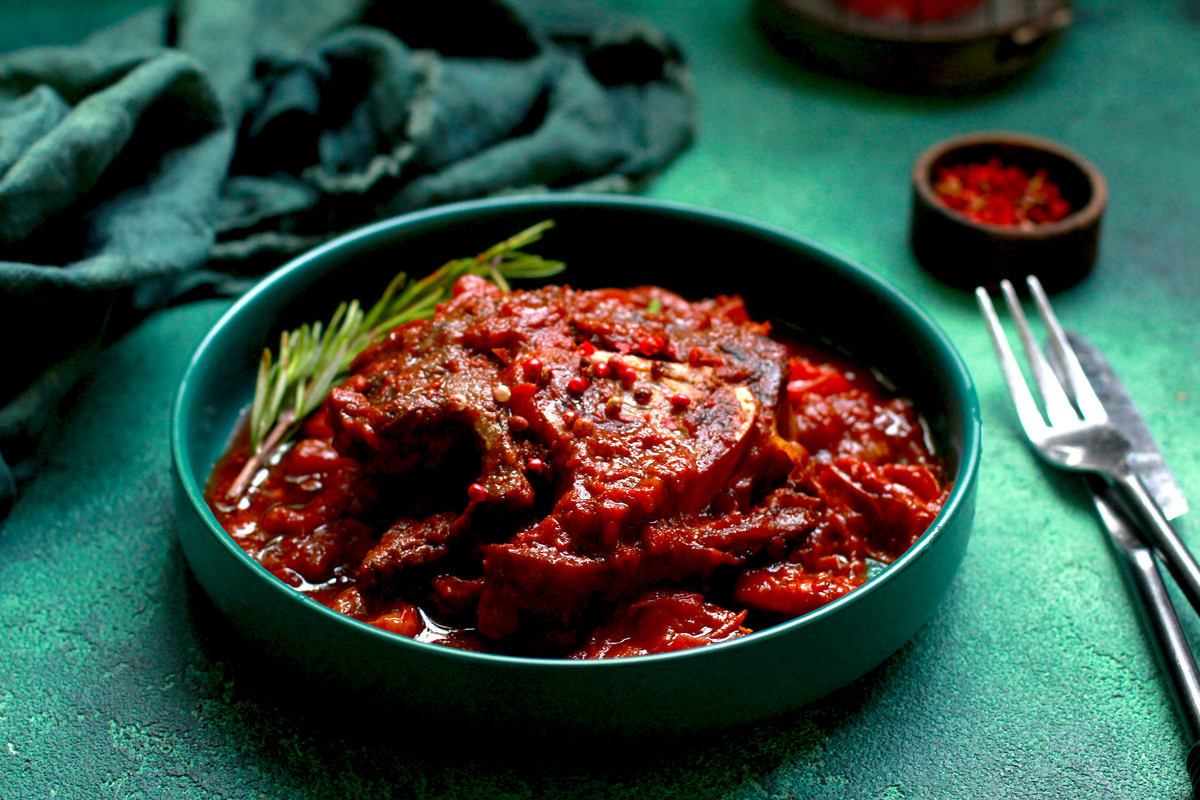 Телячья голень, тушёная с помидорами и розмарином