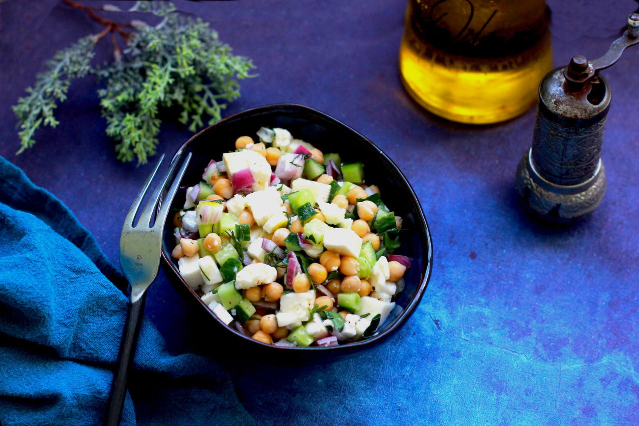 Нутовый салат с сыром фета и огурцом
