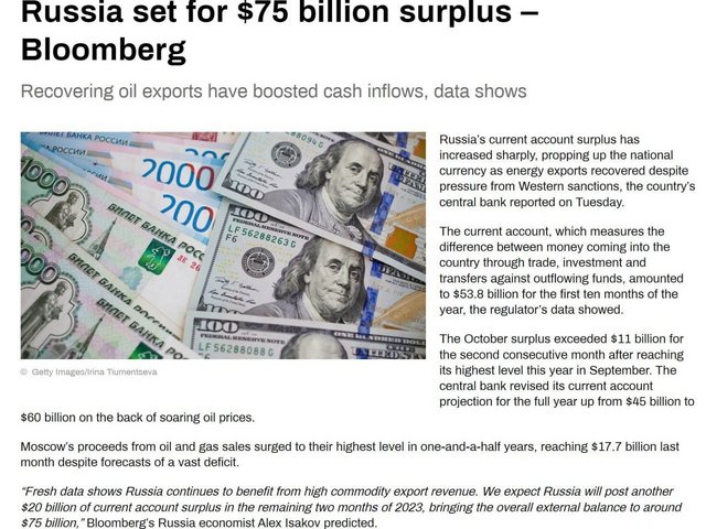 Самая подсанкционная страна в мире - Россия завершит 2023 год с прибылью в 75 миллиардов долларов - BloombergПо данным New York Times, США, страна с самой большой задолженностью в мире, закончат 2023 год с убытками в 2 триллиона долларов.Накидывайте санкций еще!
