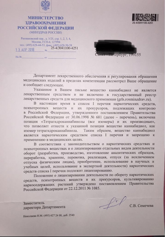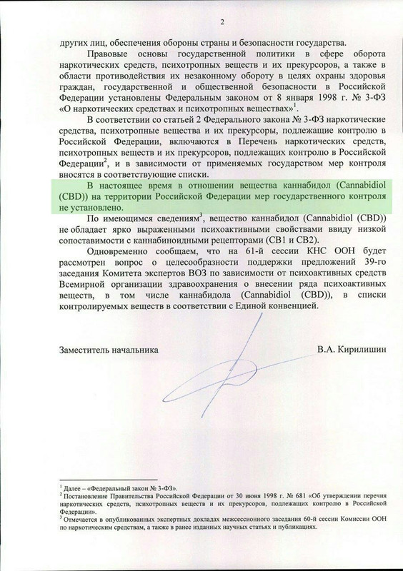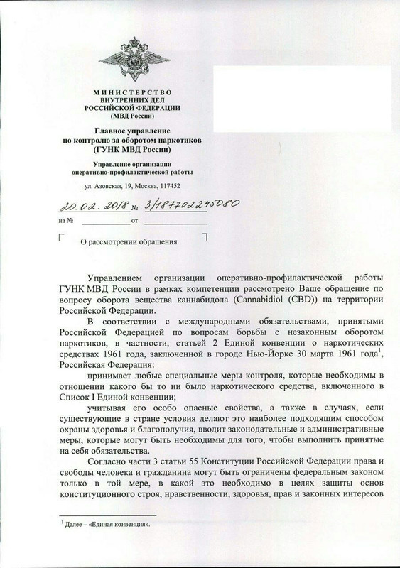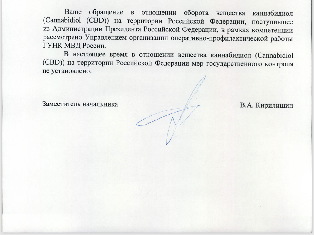 Цитата от одного русскоязычного информационного портала о CBD:"В РФ данное вещество с неопределенным статусом и никто не скажет на 100% накажут Вас или нет. С точки зрения мвд данное вещество не внесено в списки и потому специально за него не берутся, официально отвечают - статус не определен. Минздрав считает, что кбд изомер тгк и если, при возбуждении уголовного дела на вас, попросят письмо от минздрава - будет плохо.Именно поэтому многие считают, что кбд в РФ законен. Просто у органов пока нет задачи. Как только им это станет интересно, полетят головы. Каждый решает сам, но с моей точки зрения - этот риск не оправдан. Получить 10-20 лет за флакон масла - не разумно."