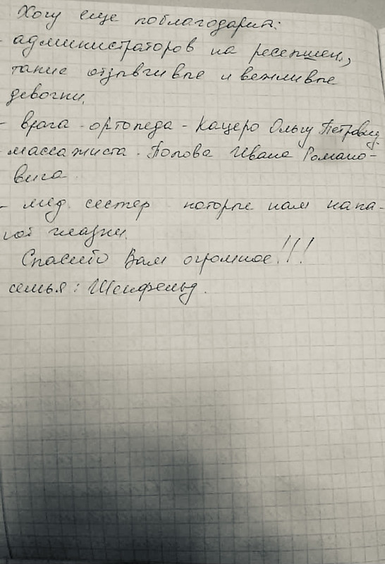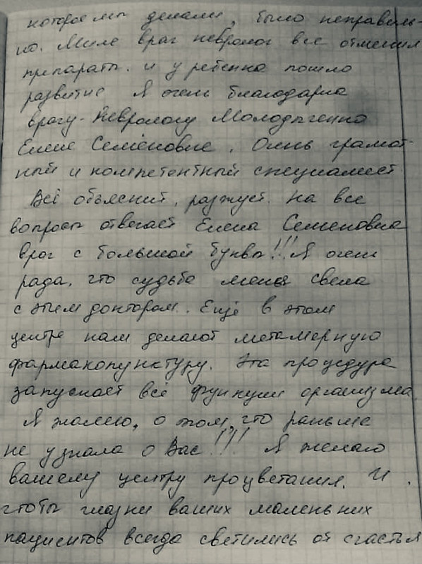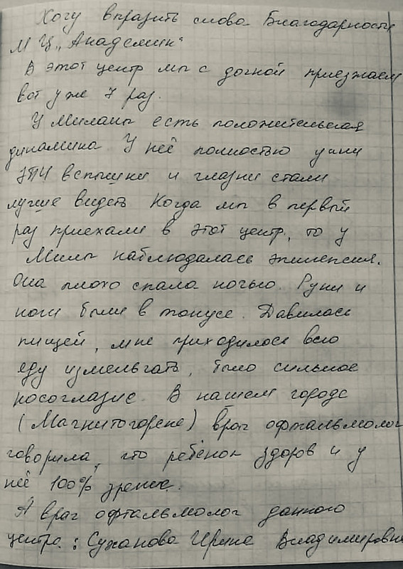 Хочу сказать слова благодарности всему коллективу .Сколько раз мы были у Елены Семеновны, уже не помню )))),много. Все процедуры Маша переносит отлично. Все домашние задания старается выполнять. Отношение замечательное. До сих пор по всем скучает, а в последний день даже плакала из за того что придется расставаться. Большое спасибо.