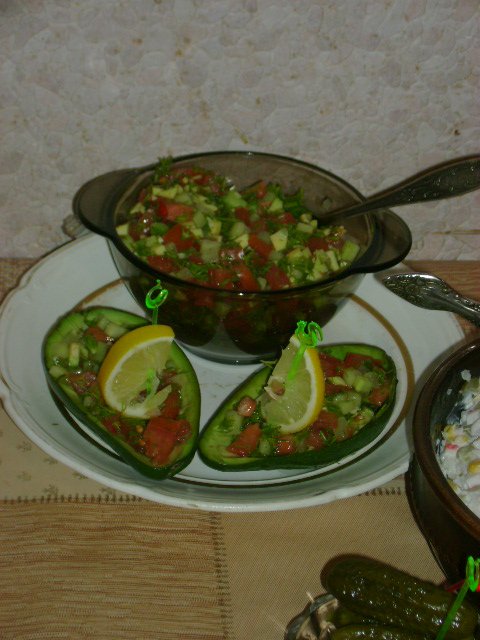 Этот салат раньше ели только я и мой брат, а теперь и детки распробовали. А рецепт очень простой. Делаю на глаз (пропорций не знаю). Режем помидоры, огурцы свежие. Авокадо - разрезать на пополам, выскоблить ложкой и порезать. Мелко порубить укроп. Всё смешать, посолить и заправить свежевыжатым лимонным соком. Я для детского праздника делала из кожуры авокадо "лодочки" и туда выкладывала.