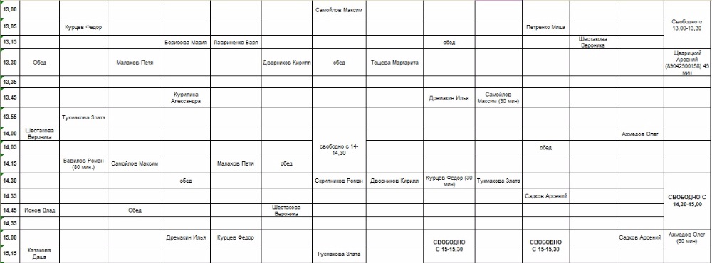 Малахова Галина.Павловы, большое спасибо за согласие, но сейчас утром еще раз посмотрела график - оказалось дело не в вас. Мне оказывается других надо попросить подвинуться. Если хотите - оставайтесь на прежнем месте, или идите на новое.Девочки, откликнитесь на мое предложениеКто не против такого порядка у Шестакова?9.00-9.30 Петренко Миша9.30-10.00 Павлова София (или где были раньше)12.00-12.30 Нечаев Ярослав12.30-13.00 Борисова МарияБорисова мария ЛФК 13.15-13.45Тогда я смогу вернуться на 12.30 на ЛФК к Артему и на 45 мин массажа и будет у меня счастье!Пожалуйста откликнитесь, соглашайтесь (или нет)Мне кажется, я неплохо придумала, всем вроде неплохо, но может быть чего-то не увидела, каких-то пересечений Жду ответов. Ну пожалуйста!!!
