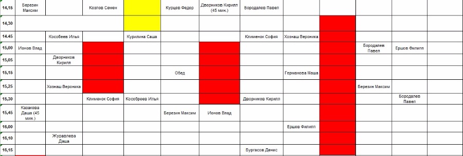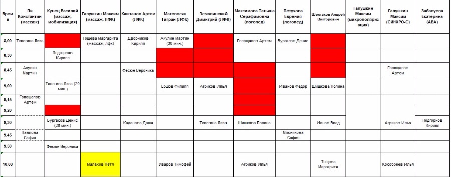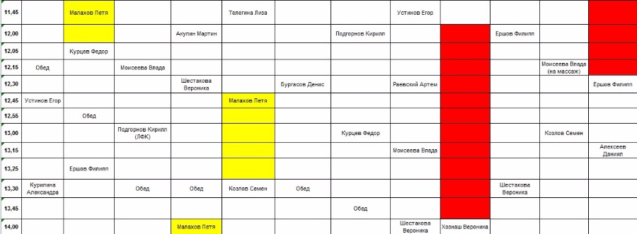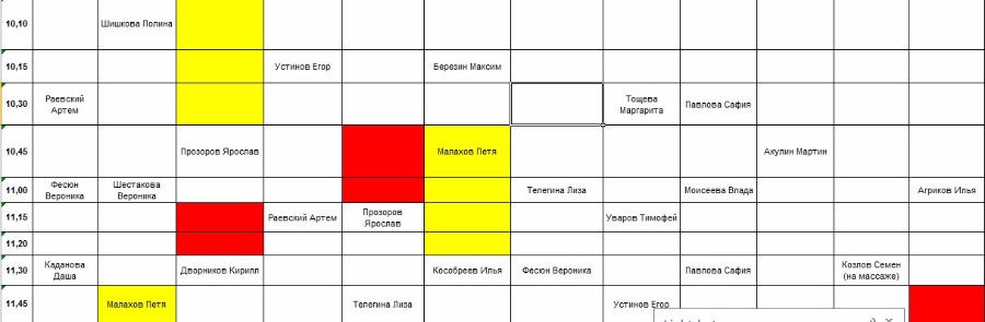 От Малаховой ГалиныТанечка! А если вот так попробоватьПрозоров Ярослав - 10.45-11.15 Тигран 11.30-12.00 Максим Массаж (ухудшение на 15 мин)Козлов Семен 10.45-11.30 Максим массаж 13.15-14.00 Тигран (значительное ухудшение, кажется 45 мин, но может быть они живут?)Телегина Лиза Тигран 11.30-12.30 ТигранМалахов Петя Тигран 12.30-13.15 Выигрываем 15 мин, если конечно Козлов Семен согласитсяЧто думаете?