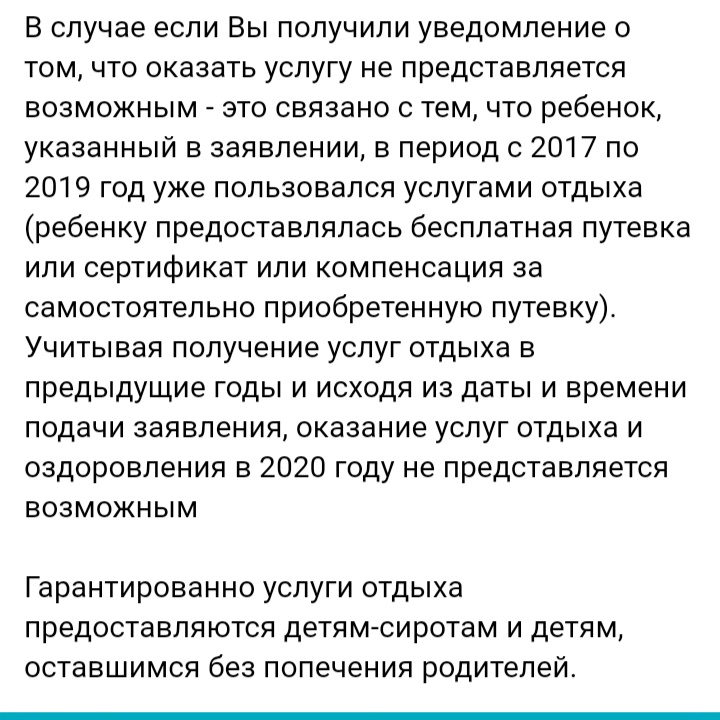 Цитата: кисярыба от 18 Января 2020, 19:55:51У меня правда ощущение, что если бы я не в 16 часов подала заявление, а раньше, сразу, то нам бы дали, но увы , я не могла раньшеУ нас в ответе так же указана поездка в 17 году(не выбор путевки в 2018 не указан). Заявление подала в 11.55 тоже отказ. Может если в 10 толк бы был... Хотя может и в 10 подавший с отказом найдется