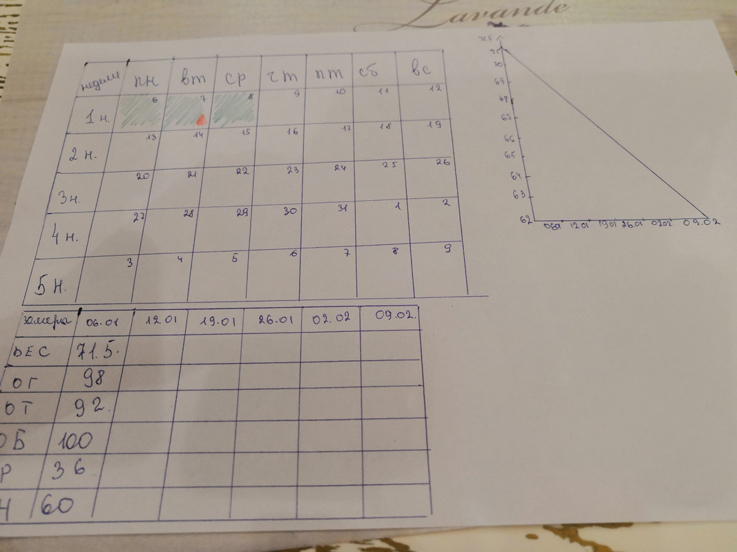 Ольга , 42 года, рост 164. Вес 67.1. За марафон задача скинуть 6 кг, до 61. Всего хочу быть 57