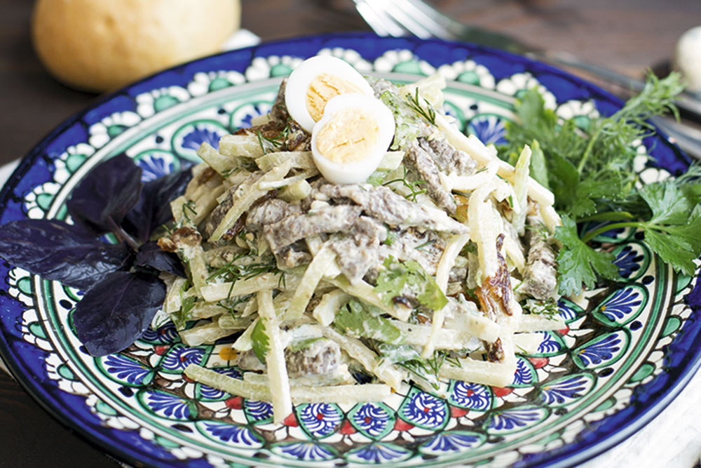 Редька зелёная, мясо говядина варёная , лук жареный и соус на основе греческого йогурта