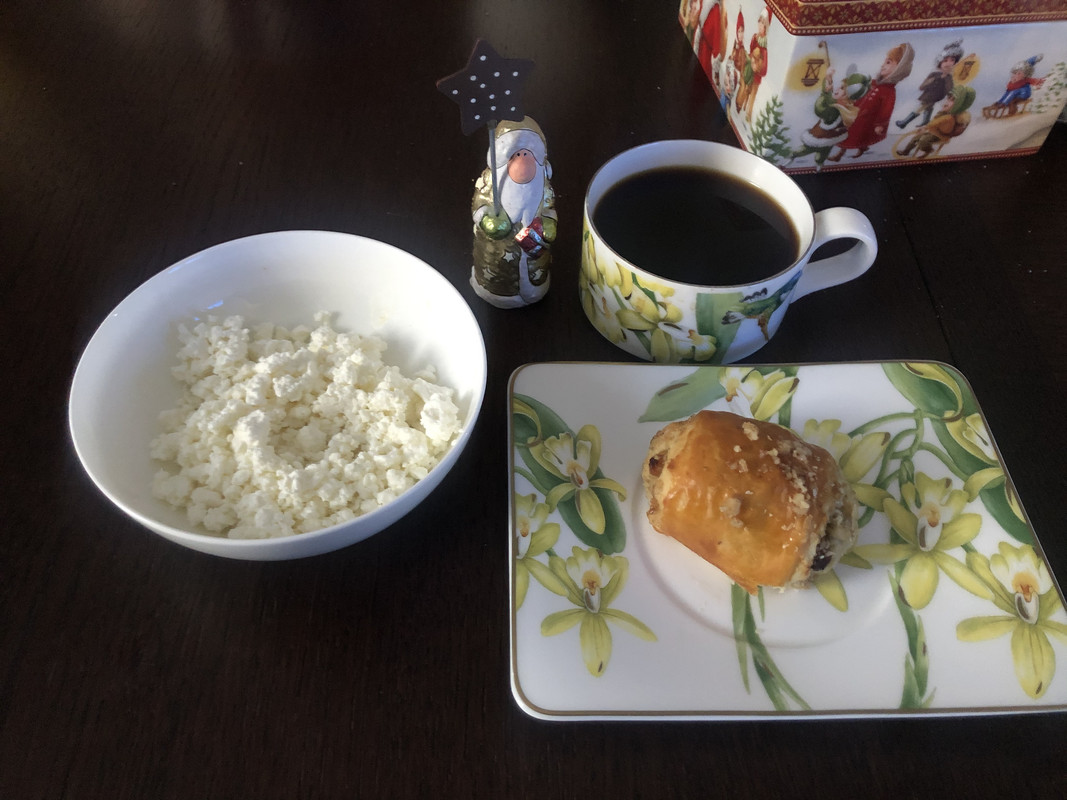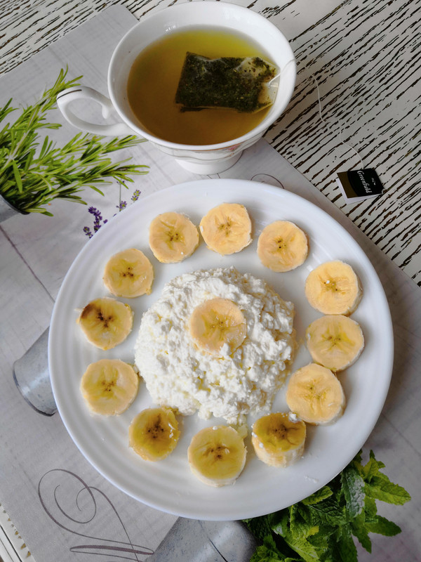Творог с чуть чуть молока, чтоб не сухо, банан и чай зелёный, можно чёрный, можно 1 рд кофе без сахара