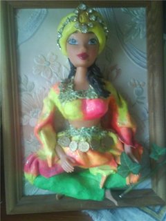 А начинала я соленое тесто очень интересно,может дам идею для девочек,кто только учится. Я покупала фигурки куколок дешевые и облепливала их тестом,делала одежду в восточном стиле,было очень красиво и интересно. Таких куколок вставляла в маленькую рамочку,у мамы лет десять провисели картинки эти,потом она раздала. У родных,уже писала,больше 20 лет сидит такая восточная красавица. Удивлена,что тесто даже трещин не дало.