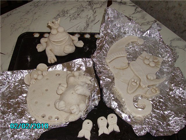 В соленом тесте все таки надо соблюдать пропорции.сушить правильно.Еще оно не любит тепло наших рук,долго мять не желательно.Правильно сушить.Ну зимой я сушила на батареях,только сверху досточку,чтобы не соприкасалось,а было такое что сушила на стекле на фольге,рядом с батареей,сушиться долго,если быстро хотела,то духовка,на самую маленькую темпу,полуоткрытая и ждать,следить,чтобы не подгорало. Клей ПВА добавляла и обойный клей, сейчас на ютубе видела девушка цветы делает по новому рецепту,думала попробовать.Давненько я тесто не лепила. Может когда нибудь вернусь к нему.Розы лепила,подковы,русалку,часы облепливала. Многие просили моих котов на холодильник,первые коты были из соленого теста,потом стала делать из пластика,потому как жалко если тесто треснет.
