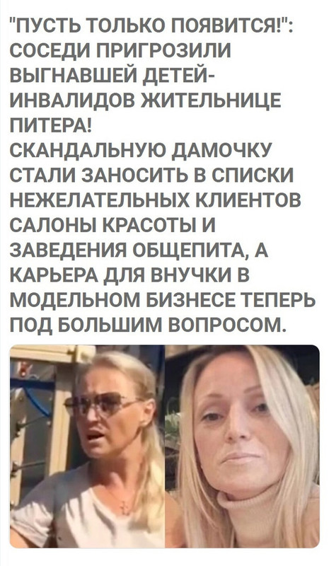Просто для информации.:) Читала коментарии про это. Так на вскидку очень много кто поддерживает эту женшину в ее позиции и чуть побольше тех, кто просто против этой травли этой женшины. Мноние пишут что воспитатели сами хороши, что центры такие должны огороженые площадки иметь как и любое деиское учереждение, что ее провоцировали. И много противников больных детей в обшестве. Вообщем про травлю этрй женщины сплошной блеф. Иак что не переживайте за нее