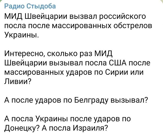 Цитата: Vera77ber от 12 Октября 2022, 11:39:37Цитата: Жанетта от 12 Октября 2022, 10:52:27 Если сюда бы зашли хохлы,эти бы первыми с караваем бежали их встречать и на нас стучать.и много таких?Хватает,а тут докапались конкретно до Херсонской и Запорожской. Были люди, кто приезжал из Горловки и рассказывал, что русские танки по всему городу, местных расстреливают. В то время там не было ни каких войск.