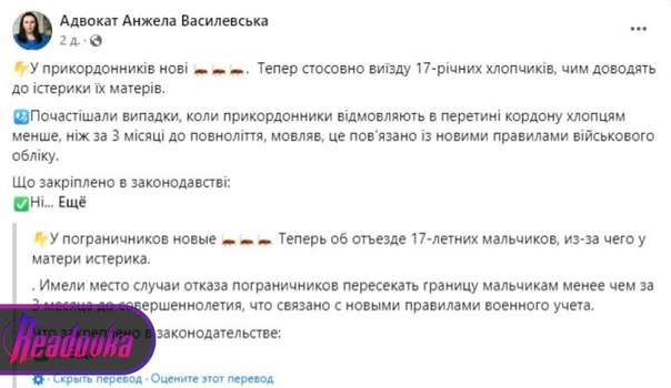 Этот пост адвоката, которая не скрывает, что она на стороне матерей и их детей, только подтверждает недавние сообщения об отказах на границе, причем тогда утверждалось, что пограничники не пропускают никаких мальчиков, а не только тех, кому осталось только три месяца до совершеннолетия. Мужчин, кто в состоянии держать оружие, на Украине становится все меньше, киевский режим как будто уже загодя готов забрать в мясорубку и мальчиков.