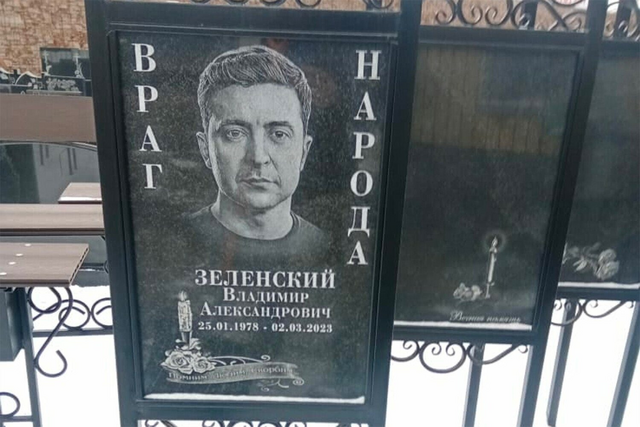 Выставленный памятник принадлежит торговой точке, торгующей ритуальными товарами около кладбища. В качестве «даты окончания жизни» украинского лидера указано 2 марта 2023 года🤔