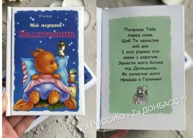 В одной из молитв украинским детям советуют молиться, чтобы Бог "защитил отца под Донецком, как прадеда в Галичине".