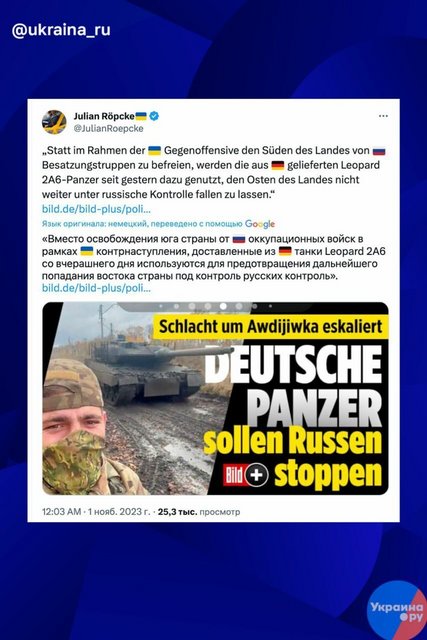 "Вместо того, чтобы освободить юг страны в украинском контрнаступлении, танки Leopard 2A6, доставленные из Германии, вынуждены защищать восток страны. Со вчерашнего дня они были замечены под Авдеевкой, где идут тяжелейшие бои, а русские упорно наступают", - с нотками грусти пишет военный эксперт издания Bild Юлиан Рёпке.