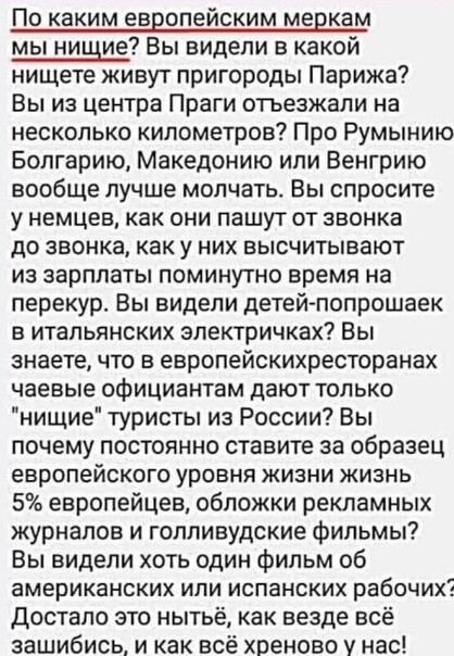 Цитата: Елена С от 12 Августа 2022, 21:39:42Ну прежде чем митинговать, давайте остановимся и подумаем. Я сейчас «власть» ни сколько не защищаю, пишу ради объективности. У нас пол страны налоги не платят, откуда возьмётся пенсия для путешествий? Острый вопрос с учителями и врачами. Недобора ни в медицинские ни в педагогический ВУЗы нет, каждый год выпускают. Вопрос: Где молодые специалисты? Ответ: сидят в офисах или « фрилансеры» Очень часто ЗП в офисах меньше, чем у врачей или учителей, но и ответственности 0, а главное можно «сидеть» им так удобно. Работают программы «Сельский учитель», «Земской доктор», но в деревне скучно. Родители же уверены во всем виновата власть. Много ещё можно написать и про «активную жизненную позицию» и про «под лежачий камень вода не течёт» и про «интернет ресурсы», где можно написать про недоработки местной администрации. Я к тому, если «обсираете» власть, «обосрите» и тех кто не платит налоги, не работает и т д, ради объективности, а то одно лицемерие и желание видеть то, что хотите, выражаясь вашим языком. А когда ЖОПА , то это в первую очередь в голове.