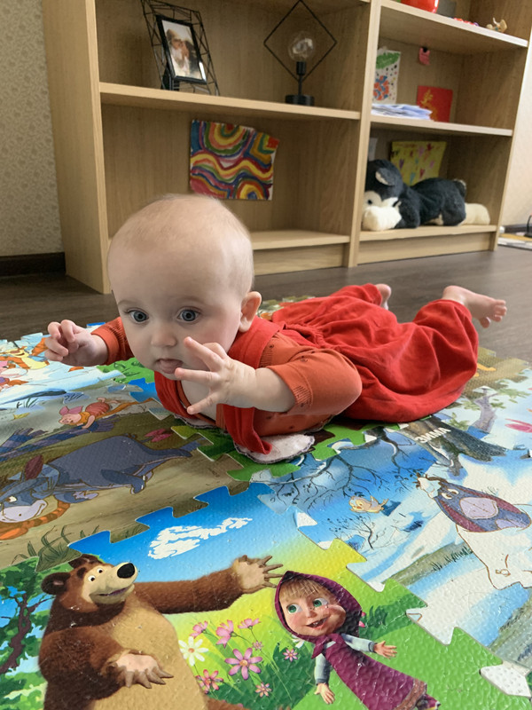 Здравствуйте, дорогие мамочки форума! Я к вам за советом и поддержкой. Дочке 5 месяцев 5 дней. Несколько дней назад закончили курс массажа, занимаюсь постоянно в течении дня по сайту Пойду сам. В середине курса массажа дочка начала поднимать попку, при этом класть голову, тем самым продвигаться назад. Я этот метод называю гусеница. Таким же способом научилась переворачиваться с живота на спину. На сайте пишут, что это тупик и нужно обязательно блокировать эти повороты. Что я собственно и делаю. Сейчас делаю акцент на упражнениях для ползания по-пластунски, поворота вокруг своей оси. Дочка очень плохо задействует ручки, часто поза самолётик выскакивает, при этом не опирается на прямые. Максимум вытягивает вперёд. Попытаюсь прикрепить видео и фото для наглядности. Вопрос как стимулировать ещё ползание можно? Опора на ручки? Делаю упражнение тачка, немного стало получаться после курса массажа. При подтягивании лёжа на спине ручками вес свой удерживает, но почему не использует их, лёжа на животике?