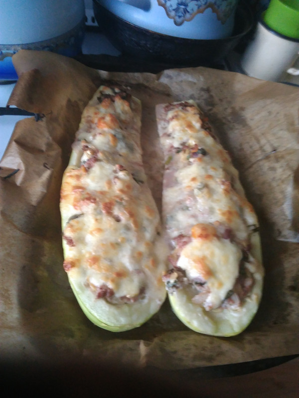 Сезон Начинка - говяжий фарш, + морковь, лук, середка кабачкаобжаренные, под сырной корочкой.И салат из Айсберга, гороха, огурца.