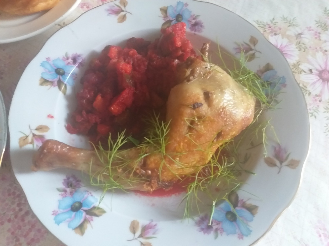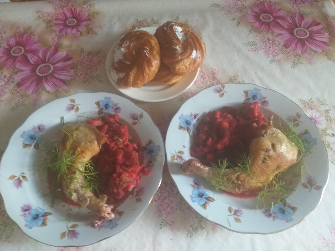 Сегодня вечером будет салат овощной из моркови, свёклы и маринованных огурчиков и жареная курица...