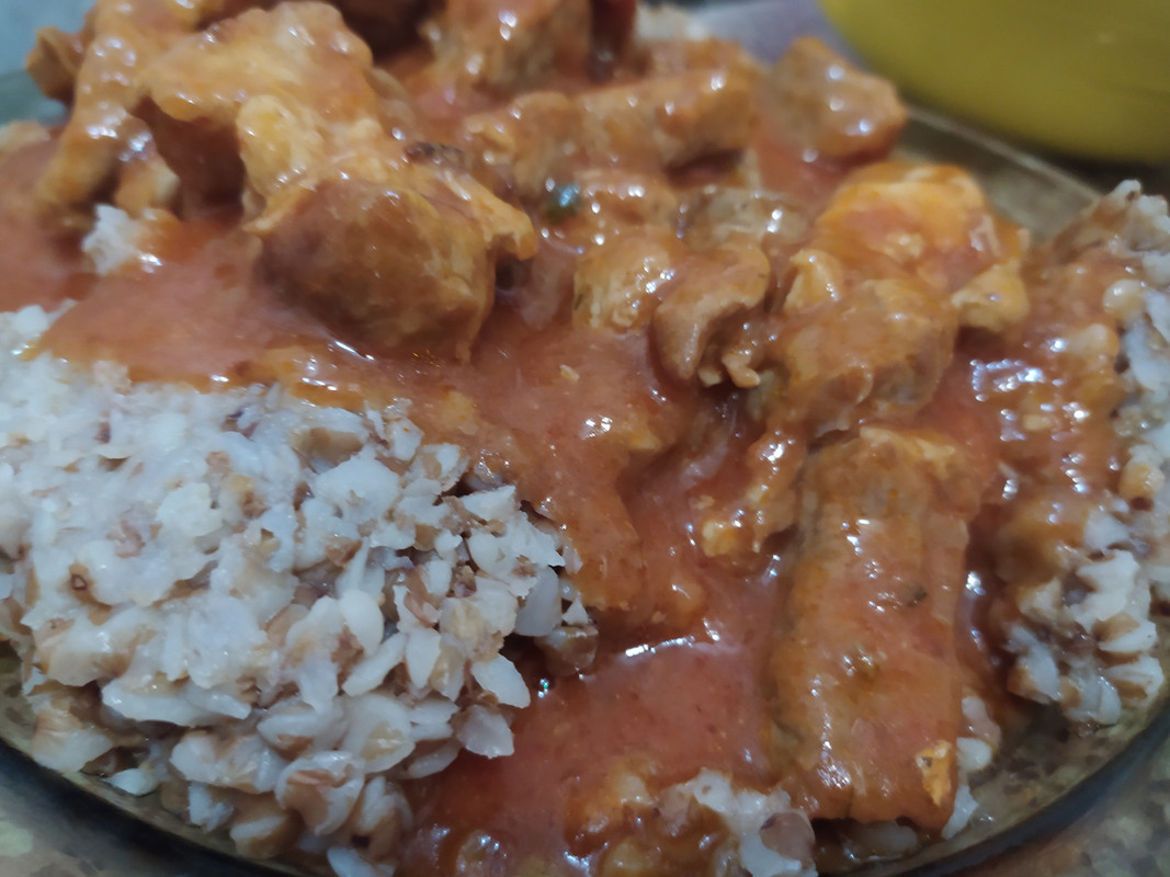 . У нас пюрешка с тефтелей и маринованные огурцы-помидоры-патисоны. Кислющие как я люблю