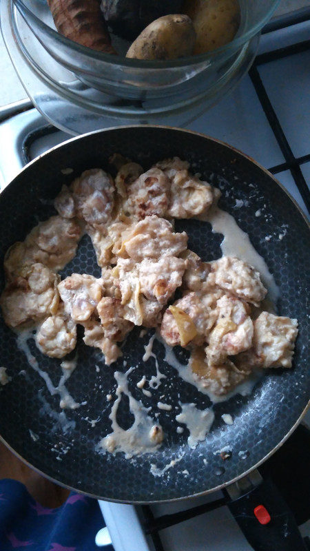 Поддержим рыбные дни!Языки трески в сметане, картошка пюре, квашеная капуста с клюквой, соленые огурцы.