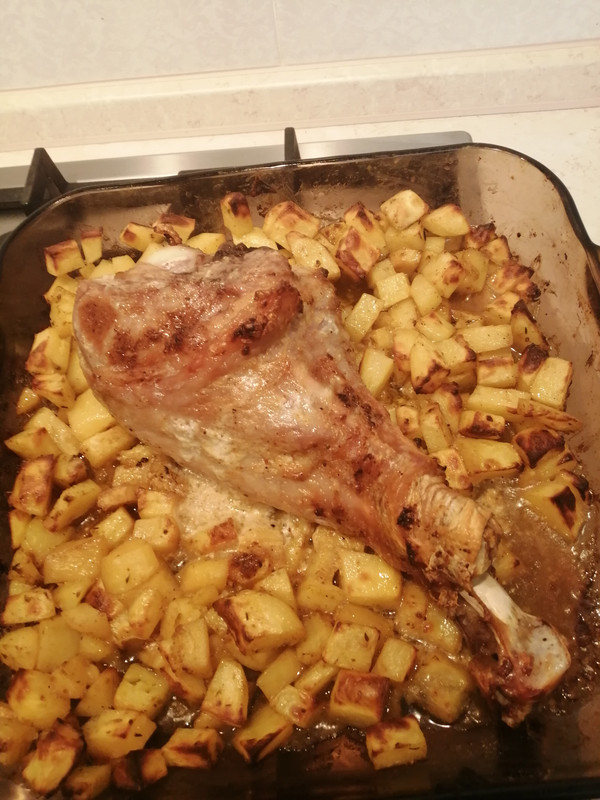 Голень индейки запеченная с картошкой, капуста квашеная. Печенье и конфеты из новогодних подарков. Груши.