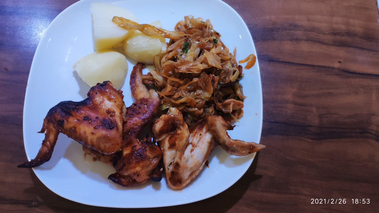 На ужин тушеная капустка (пополам квашеная со свежей) с ребрами свиными