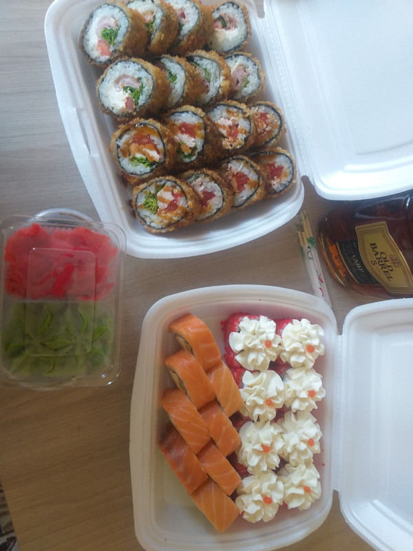 С подружкой сегодня... Роллы на заказ от "Сакуры", коньяк... Хотя говорят, что коньяк к роллам не подходит. Но нам на это "по барабану". Нам все хорошо...