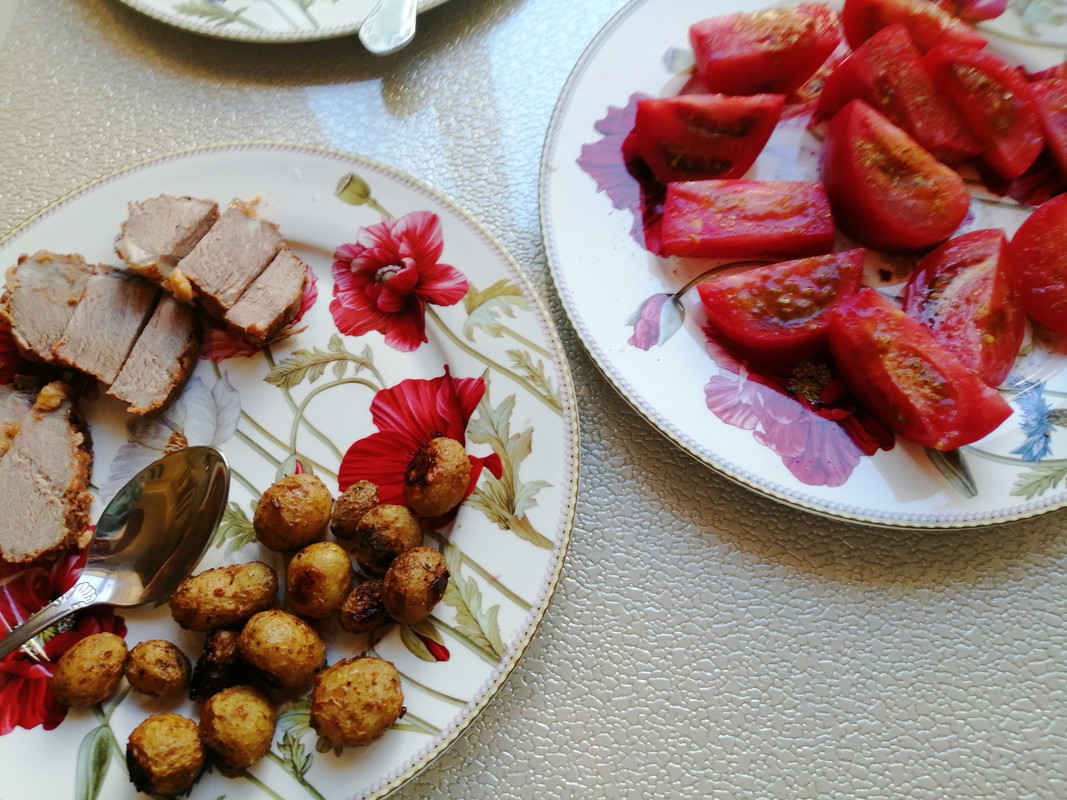 Картошка нового урожая запеченая в духовке, бужанина своя из свинной шейки, помидорки с адыгейской солью розовые шикарные продают. К чаю пенки с черешневого варенья, ну и черешня натуральная -своя созрела.