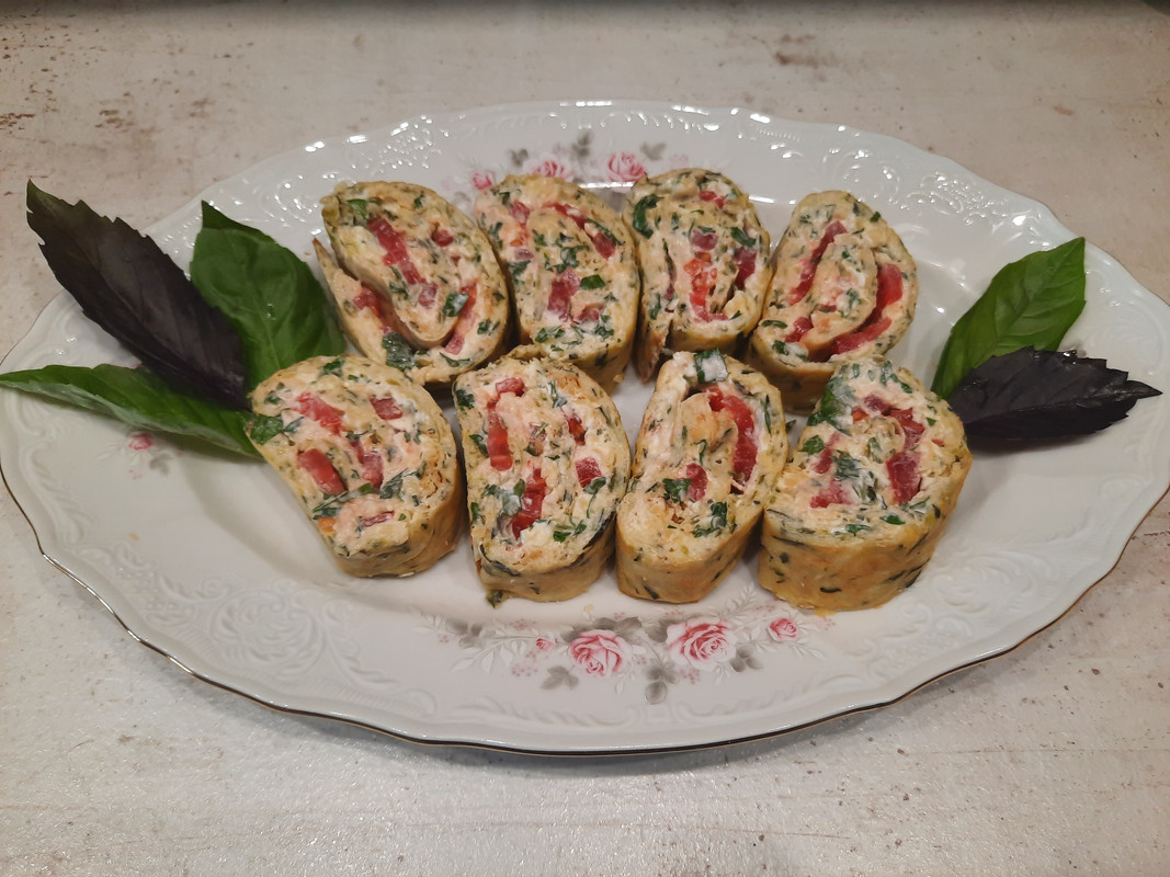 На теплый корж выкладываем сырную смесь и равномерно распределяем. Кладём помидору (лучше не очень сочную). Сворачиваем в рулет и на 30 мин в холодильник, потом нарезаем порционно.