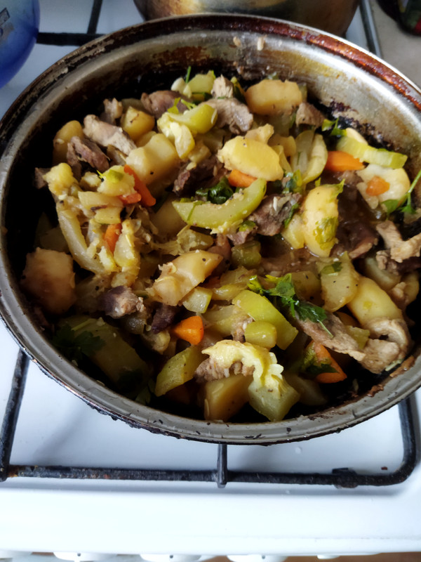 В сковородке - жаркое из свинины с овощами ( кабачок, картошка, морковка, лук, чеснок, зелень).