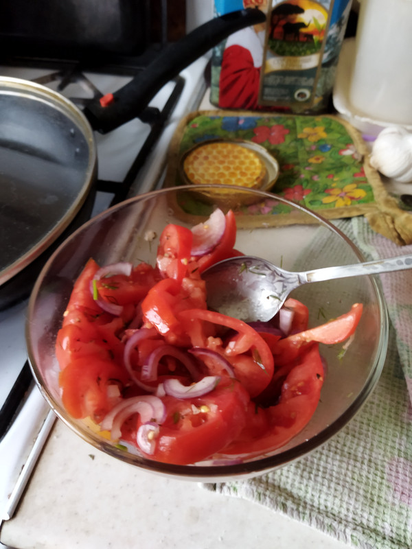 На ужин будет картошка в духовке мелкая испеченая ( вариации на тему деревенской), салака своего посола и простой салат из помидоров с луком репчатым и перцем черным молотым, с маслом. Салат этот мне всегда напоминает о деде моем, он его делал и это было таааак вкусноооо