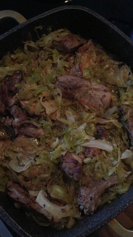 Говядина тушеная в сметана с луком и лисичками, пюре, капуста свежезаквашеная с луком, брусникой и пахучим маслом.