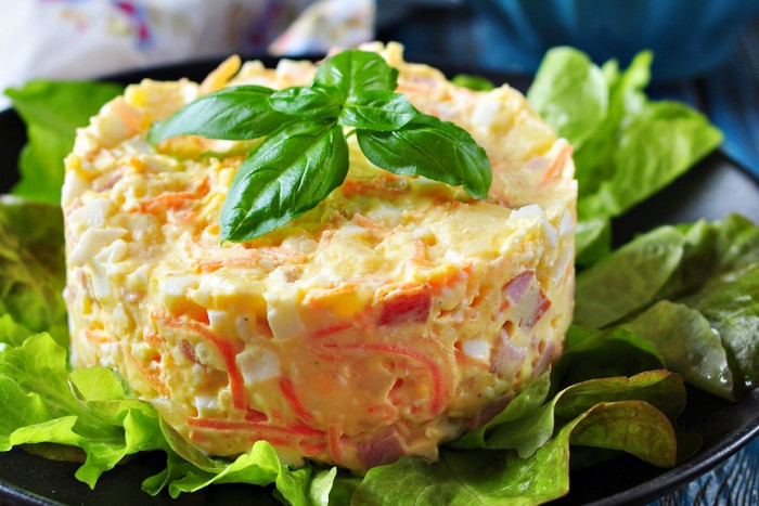 Оригинальный салат с крабовыми палочками, морковью по-корейски и сыром подойдет для домашнего застолья.