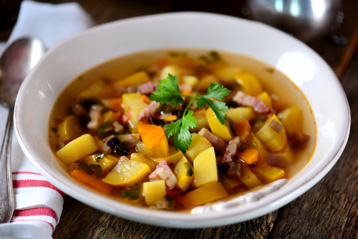 В прохладный пасмурный день, для согревающего домашнего ужина идеально подойдет тарелка горячего супа с жареным беконом, картофелем и грибами.