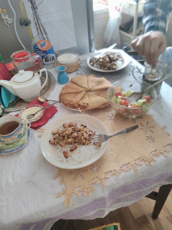 Свинские отбивные в кляре с грецкими орехами, фунчоза, салат из огурца, помидорами с зеленью и маслом, посыпаный смесью ( кедровые орехи, подсолнечник, тыква, кунжут, лен)