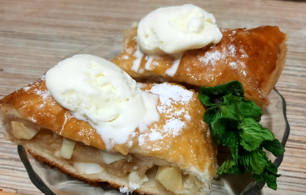 Мы второй вечер со штруделем с яблоком ,корицей и мороженым .