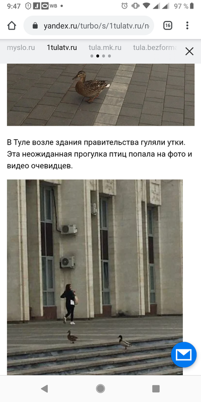 У меня утка сегодня под окном гуляла, вместе с селезнем. Купались в пруду , доедали хлеб видимо и рыбий корм. Муж из окна увидел - говорит тащи ружьё, ща их « снимем» и съедим ))